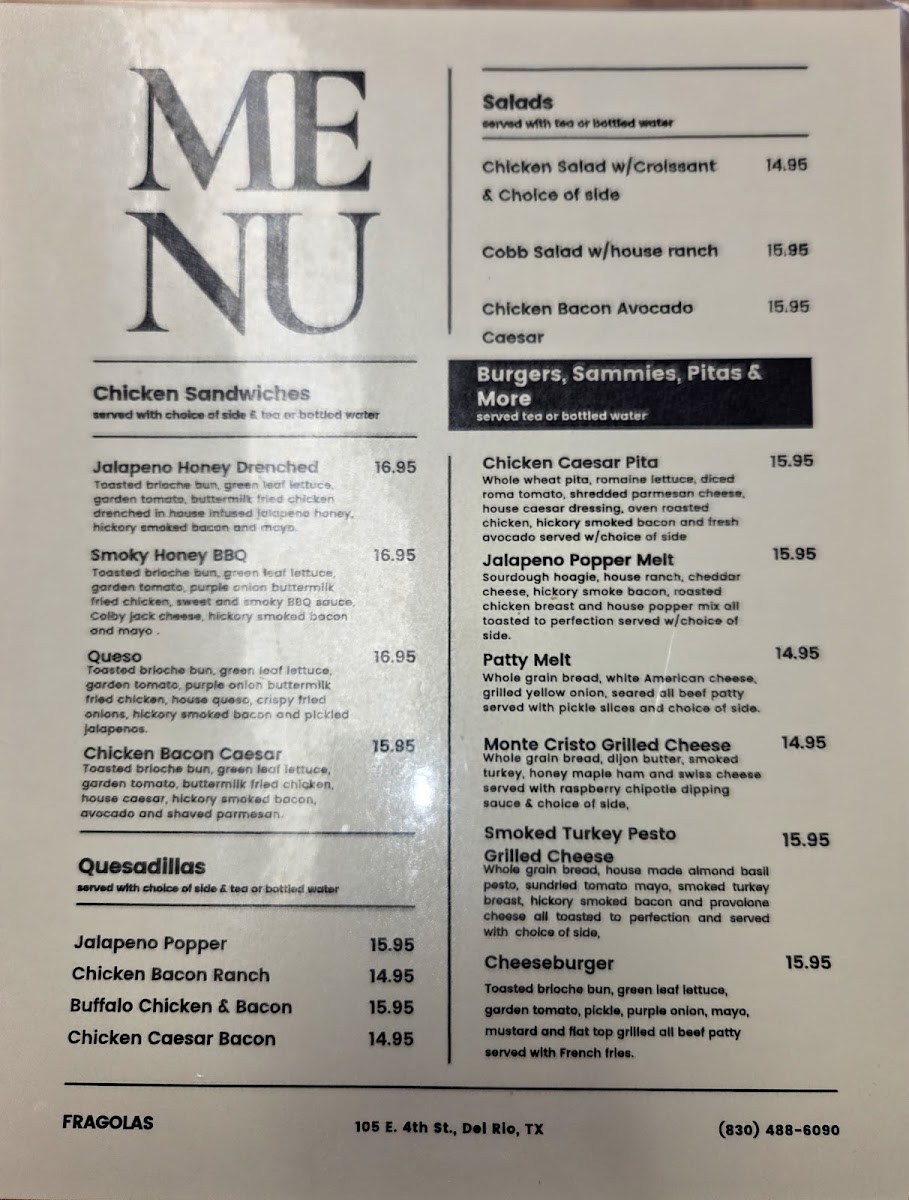 At Fragola's Catering & The Kitchen, the menu comes together as a well-rounded showcase of comfort food and casual favorites that feel thoughtfully prepared and consistently satisfying. The lighter plates, such as the Chicken Salad Plate, Salad Special, and Cobb Salad, balance freshness with hearty portions, while warm starters like Tortilla Soup set a cozy, homestyle tone. Sandwich lovers are especially well served, with standout options including the sweet-and-spicy Jalapeño Honey Drenched Chicken Sandwich, the rich Turkey Pesto Grilled Cheese Sandwich, the indulgent Crab Mac and Cheese Grilled Cheese Sandwich, and the classic Club Sandwich, each offering its own distinct personality. For those craving bold, savory flavors, items like Fish Tacos, Cali Burrito, and Chicken Taquitos deliver satisfying textures and familiar comfort. Heavier entrées such as Cajun Chicken and Pasta with Garden Salad and Country Fried Steak round out the menu with filling, traditional appeal, while simple sides like Toast quietly support the overall experience. Taken together, the menu reflects a clear focus on approachable variety, generous portions, and crowd-pleasing flavors, making it easy to find something enjoyable whether you are in the mood for something light, cheesy, spicy, or deeply comforting.